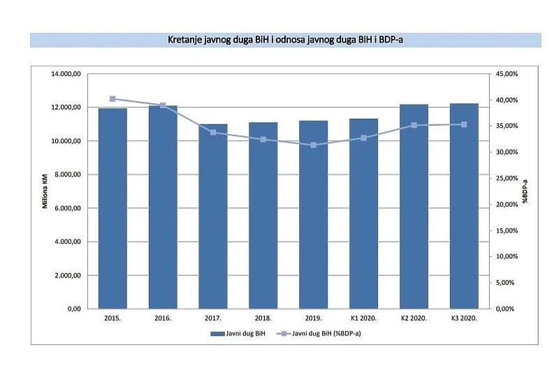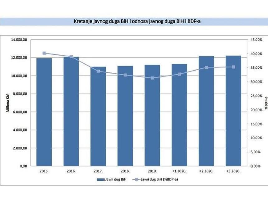 Na vanjski dug otpada 8,6 milijardi KM, na unutrašnji 3,6 milijardi, a kretanje ukupnog javnog duga je na nivou od 35 posto bruto domaćeg proizvoda BiH.
