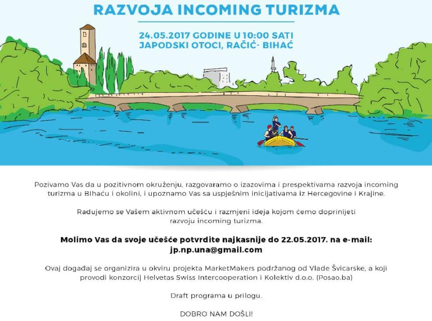 Ovaj događaj se organizira u okviru projekta MarketMakers podržanog od Vlade Švicarske, a koji provodi konzorcij Helvetas Swiss Intercooperation i Kolektiv, d.o.o. (Posao.ba) i turistički klaster Una pod nazivom BIHAĆKA REGIJA - PRAVAC RAZVOJA INCOMING TURIZMA, dana 24.05.2017. godine u 10:00 sati na Japodskim otocima, Račić - Bihać.