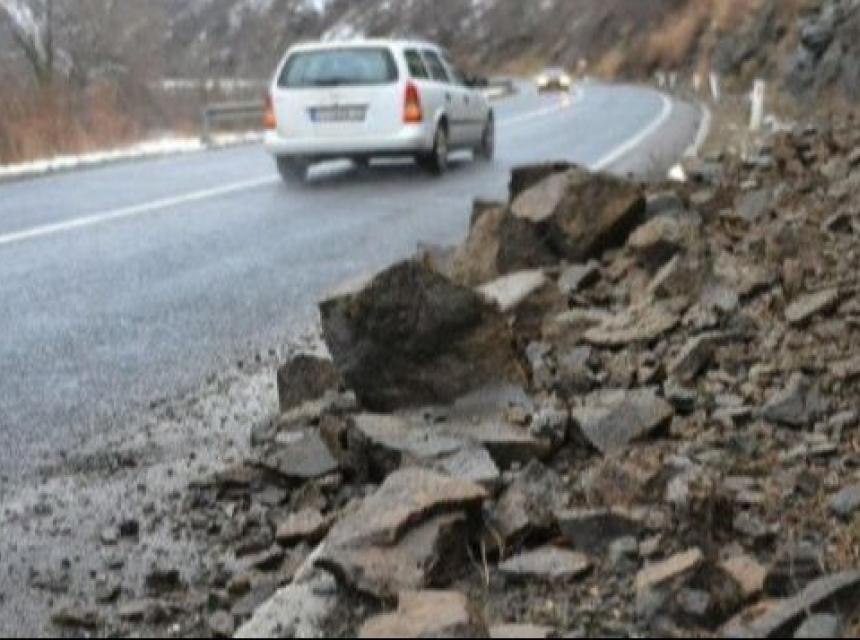 Zbog kiše koja je padala tokom noći ili još uvijek pada kolovoz je mjestimično mokar ili vlažan, a povećana je i opasnost od odrona.