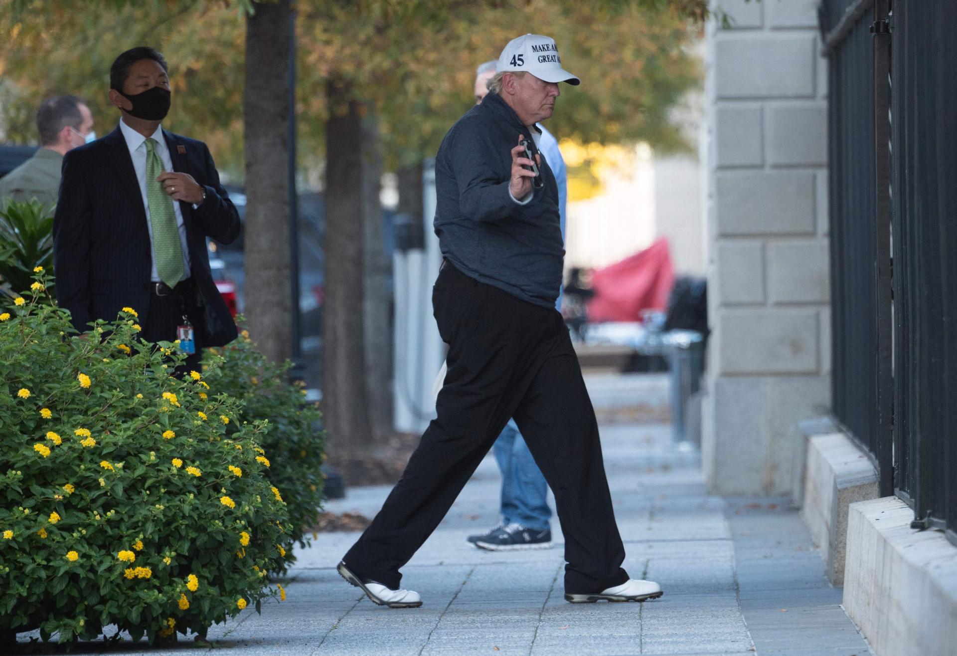 Odjeven u crnu vjetrovku, tamne hlače i bijelu MAGA, ili Make America Great Again, kapu, predsjednik je napustio Bijelu kuću nekoliko minuta prije 10 sati. Proveo je rani dio dana tweetajući o prevarama na izborima.