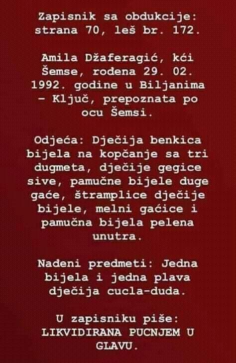Amila Džaferagić, kći Šemse, rođena 29. 02. 1992. godine u Biljanima – Ključ, prepoznata po ocu Šemsi.