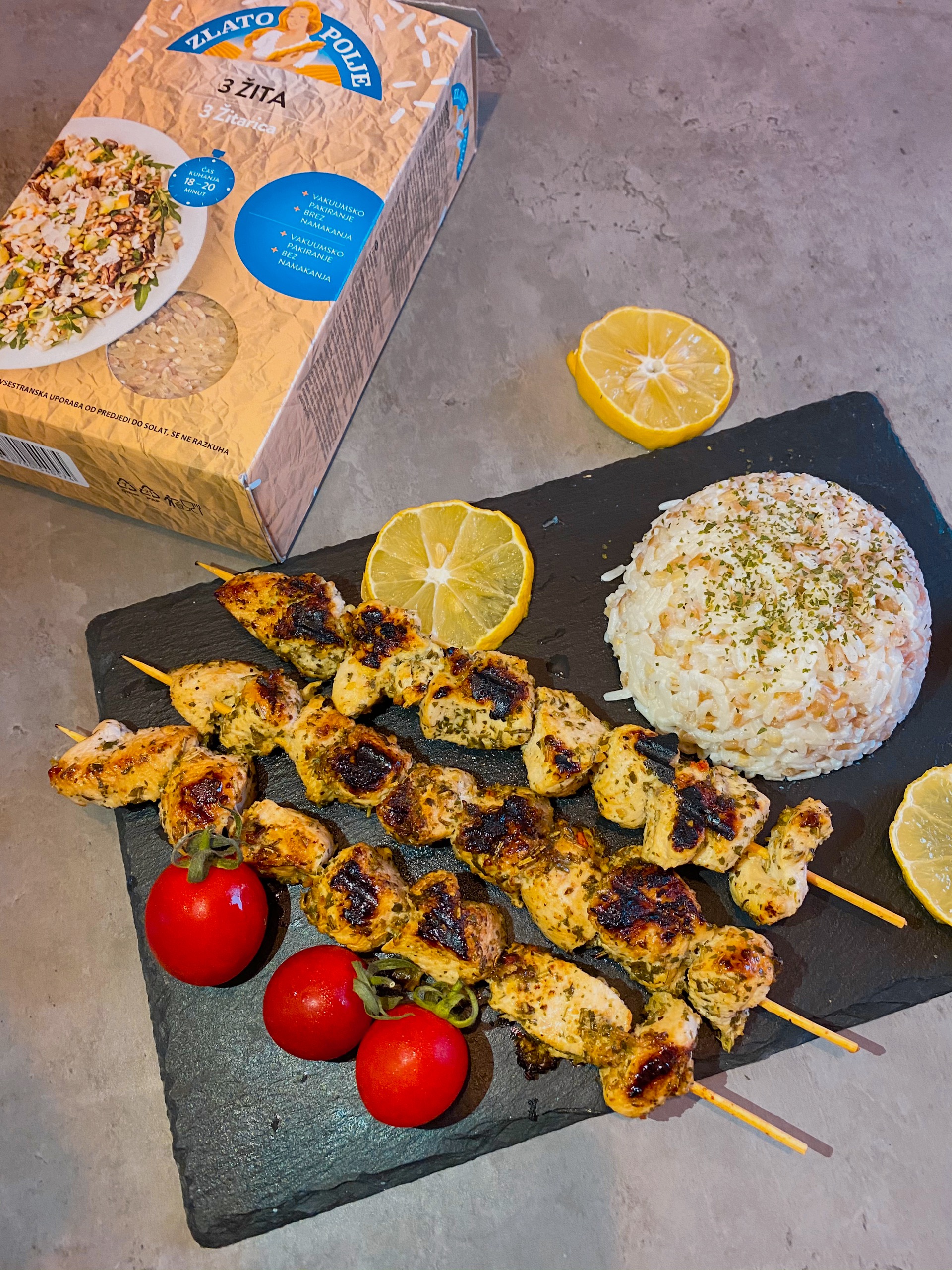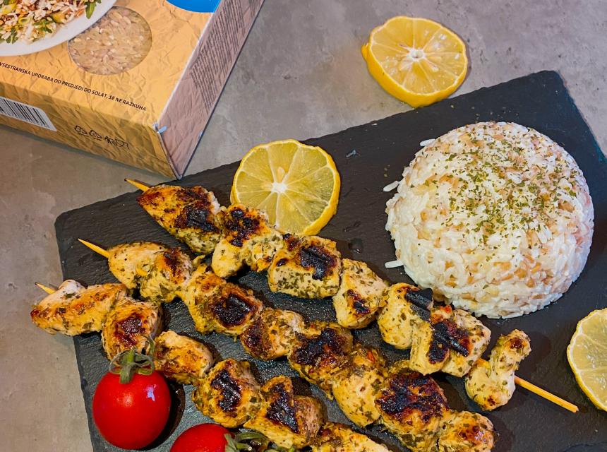 Ja sam ih poslužila sa rižom Zlato polje 3 žita, malo zdravija verzija. Kuhajte je po upsutstvu nekih 15-17 minuta, kad se skuha dodajte jednu malu kašiku putera, soli, bibera i malo vrhnja. Nećemo dodavati puno začina jer je piletina začinjena. Poslužite jelo uz svježu salatu, kod mene je to bio cherry paradajz.