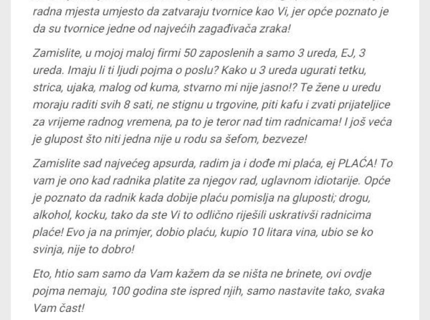 Došao ja ovdje i zamislite, dobijem posao, kakva glupost, oni otvaraju radna mjesta umjesto da zatvaraju tvornice kao Vi, jer opće poznato je da su tvornice jedne od najvećih zagađivača zraka!