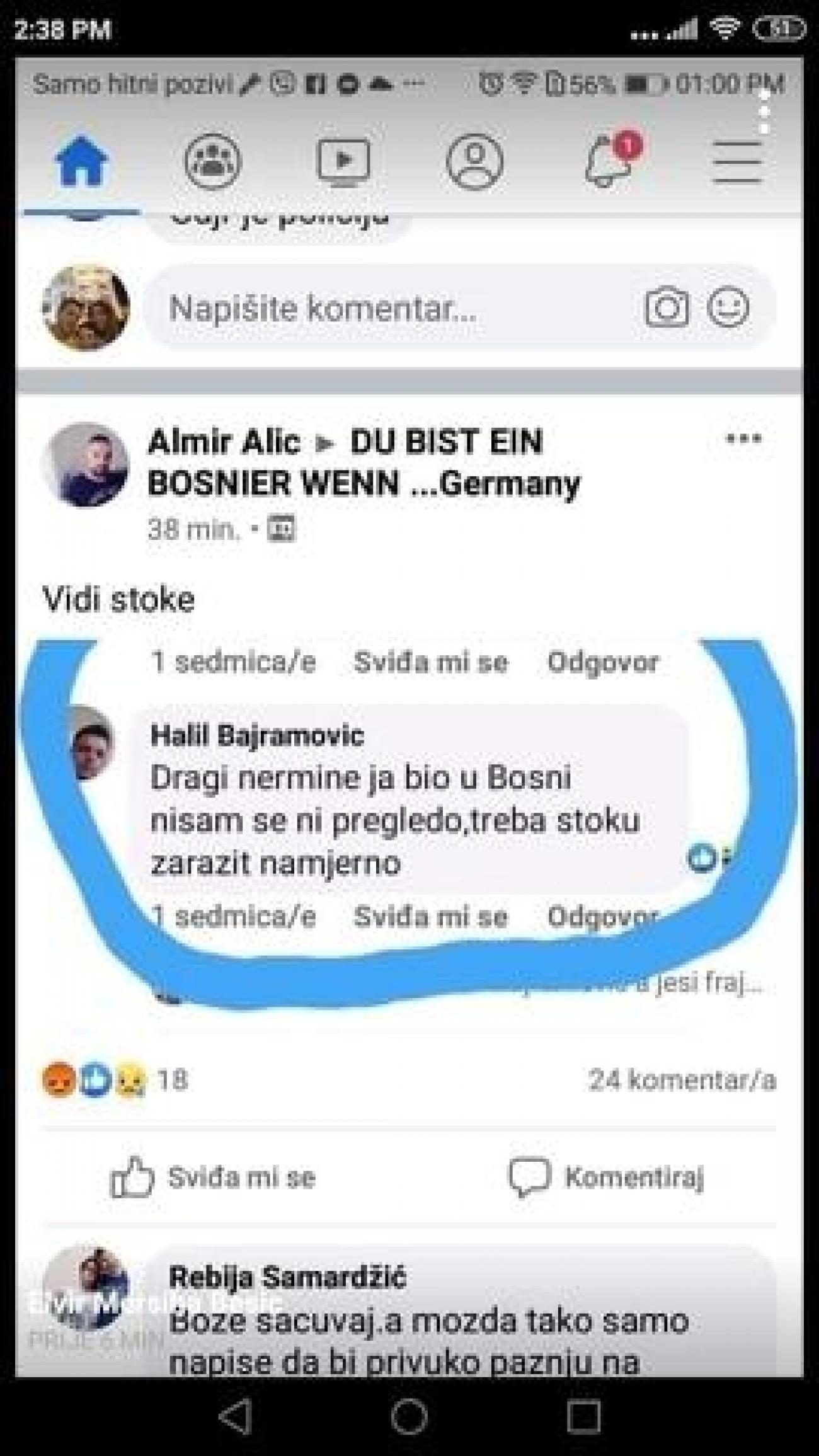 Sličan slučaj zabilježen je na jednoj Facebook grupi, čiji su članovi mahom bh. građani koji žive u dijaspori. Mladić pod imenom Halil Bajramović je u jednoj svojoj objavi napisao: Dragi Nermine ja bio u Bosni, nisam se ni pregledao, treba stoku zarazit namjerno". Kako saznajemo, riječ je o mladiću koji živi u Austriji.