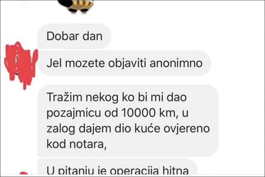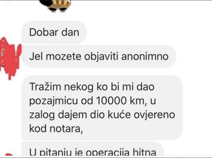 Anonimni Bišćanin obratio se lokalnom mediju Bišćani.net sa zahtjevom da objave apel za pomoć u kojem traži pozajmicu od 10.000 KM za liječenje, a kao zalog bi dao kuću.