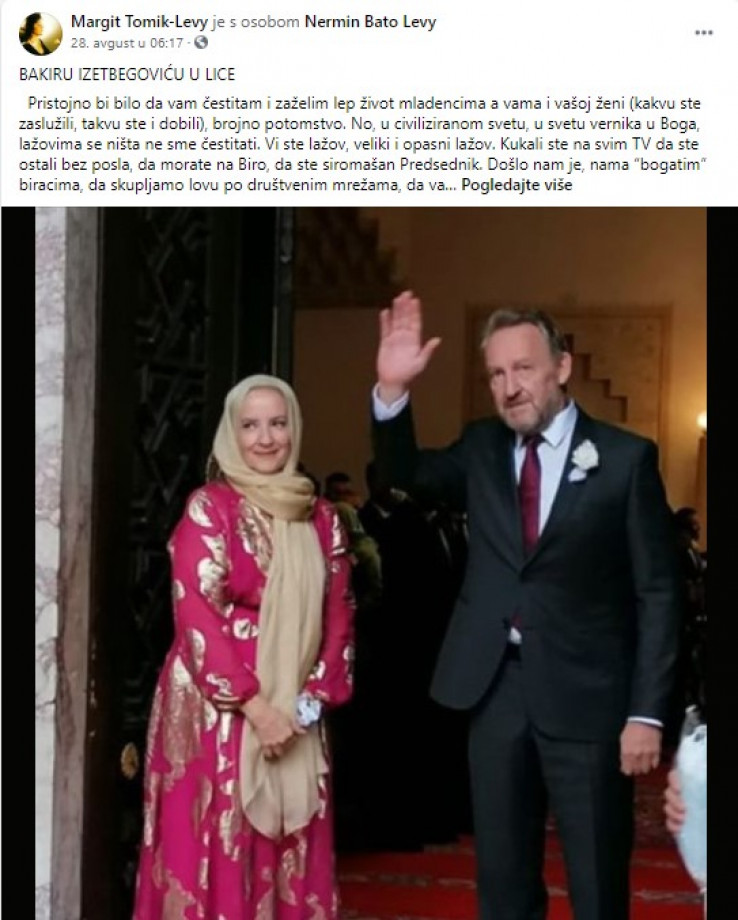 Primadona sarajevske opere u penziji Margit Tomik-Levy komentirala je na svom Facebook profilu svadbu kćerke Bakira i Sebije Izetbegović – Jasmine Izetbegović.