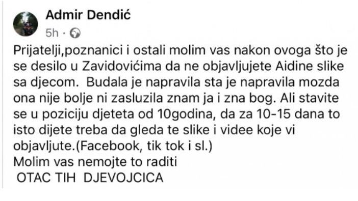On je zamolio da se ne objavljuju fotografije Aide sa djecom, a napisao je i da je ona možda i zaslužila ono što joj se desilo.