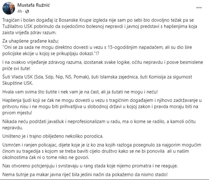 Bivši premijer Unsko-sanskog kantona (USK) Mustafa Ružnić oglasio se povodom terorističkog napada u Bosanskoj Krupi koji se dogodio u četvrtak navečer kada je maloljetnik ubio policajca Ozrena Marana, a ranio njegovog kolegu Avdu Hasanovića.