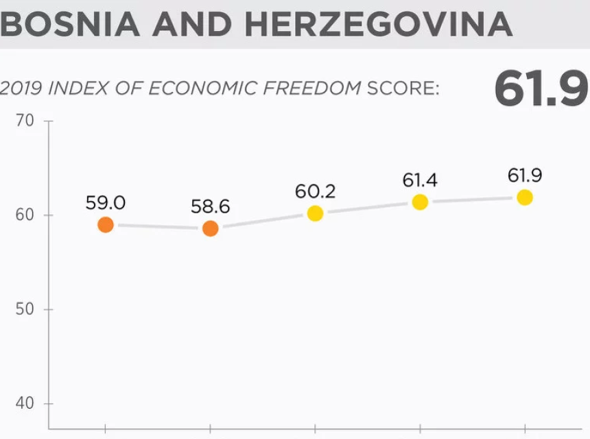 Bosna i Hercegovina se prema indeksu ekonomskih sloboda za ovu godinu, koji objavljuje ugledna američka "The Heritage Foundation", nalazi na 83. mjestu na svijetu od 180 rangiranih zemalja.