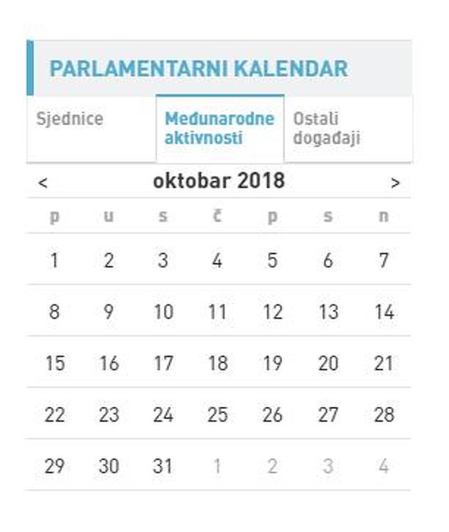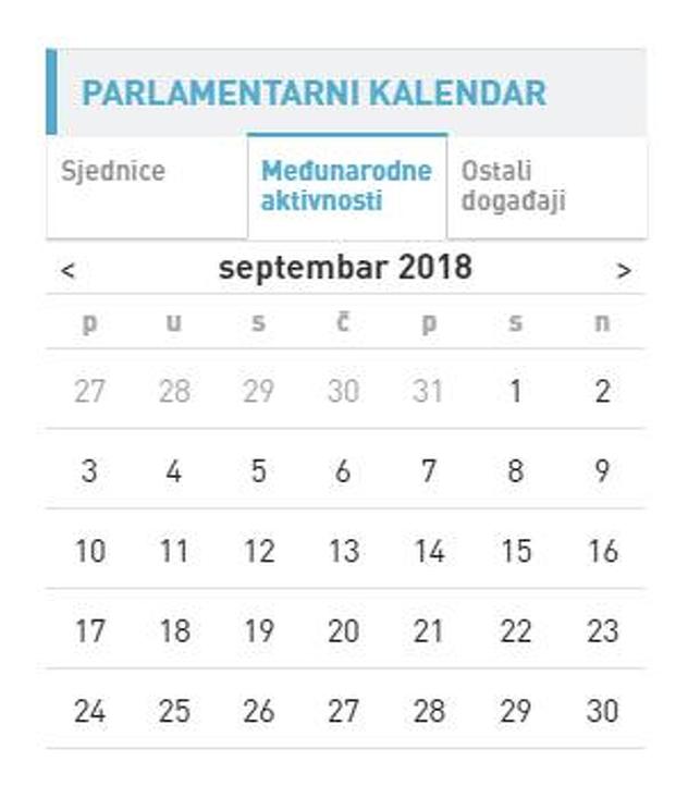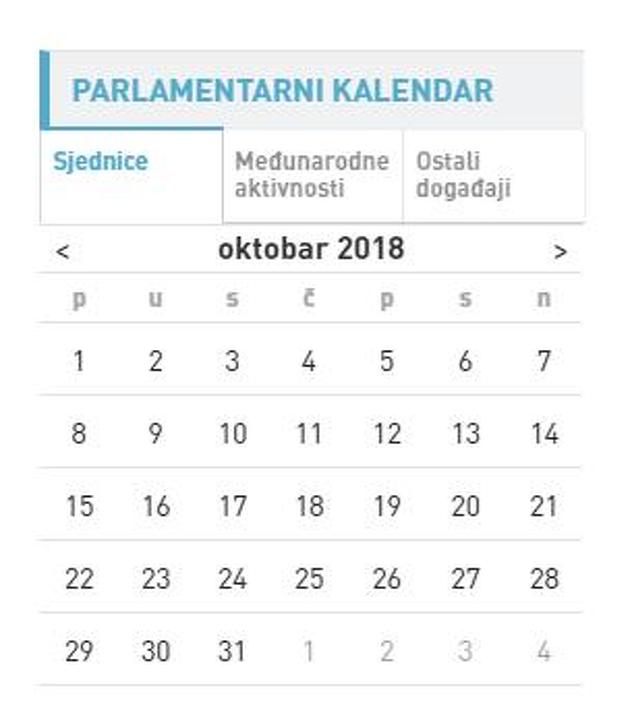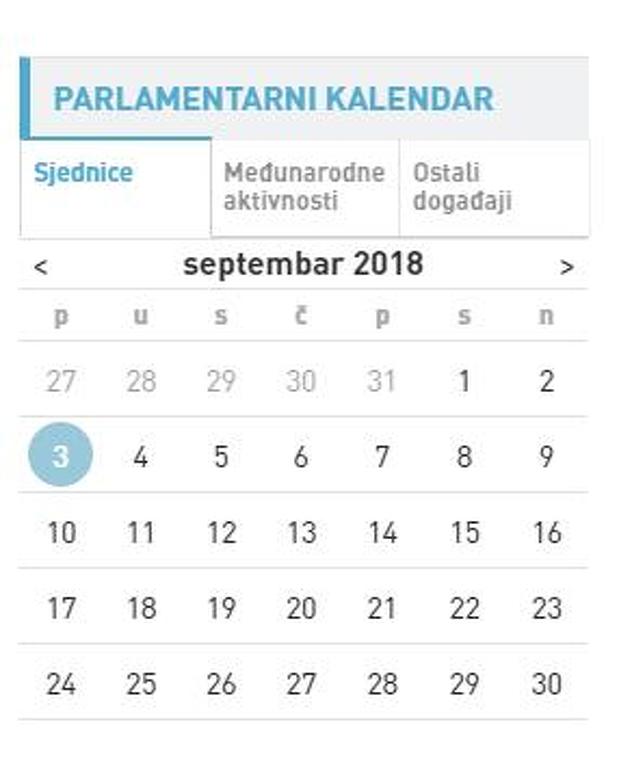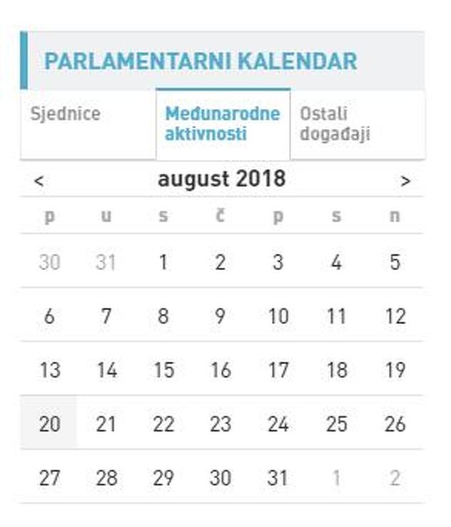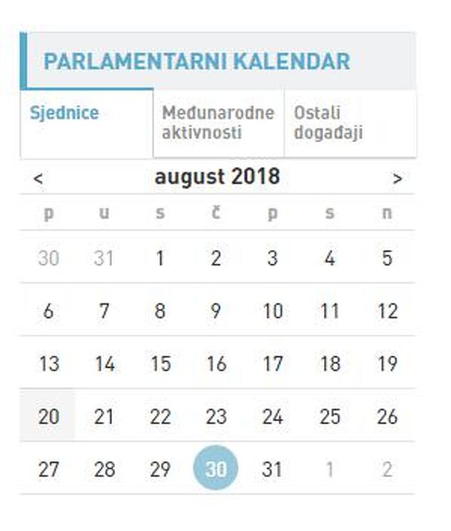 U parlamentarnom kalendaru za augustu 2018. godine najavljena je samo sjednica Odbora za žalbe građana Parlamentarne skupštine BiH koja bi trebala biti održana 30. augusta. Riječ je o nezavisnom tijelu Parlamentarne skupštine BiH koje djeluje isključivo na profesionalnim osnovama i koje ne čine zastupnici i delegati u najvišem organu zakonodavne vlasti.
