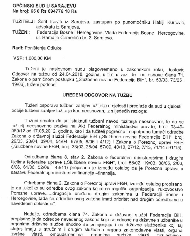 Milićević se u aktu koji je prije nekoliko dana dostavljen Sudu, između ostalog, poziva na član 74. Zakona o državnoj službi FBiH, prema kojem direktora i zamjenika direktora PU FBiH imenuje i razrješava Vlada FBiH, a na prijedlog federalnog ministra finansija.