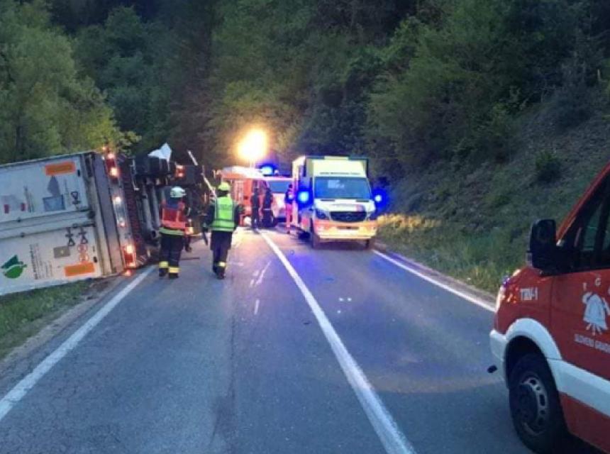 Vozač je u oštroj krivini u Pakiju kod Velenja izgubio kontrolu nad šleperom, udario u suprotnu bankinu, sletio s ceste i prevrnuo se. Nesretni vozač ostao je zaključan u kabini šlepera i poginuo na licu mjesta.