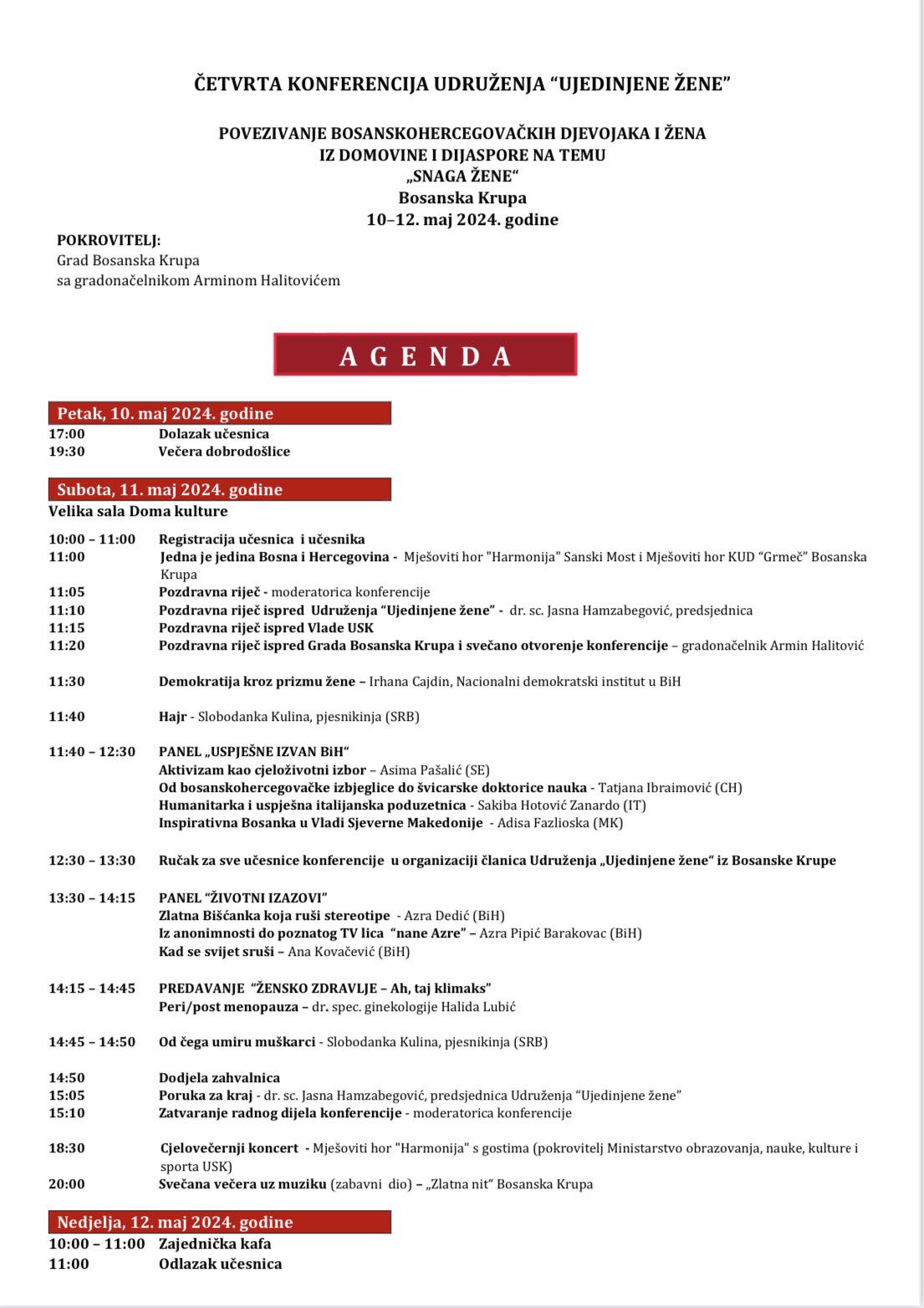 Konferencija „SNAGA ŽENE“ trajat će od 10. do 12. maja. Centralni dio održat će se 11. maja od 11 sati u Velikoj sali Doma kulture u Bosanskoj Krupi. Ko su govornice i na koje teme će govoriti možete pogledati u agendi.
