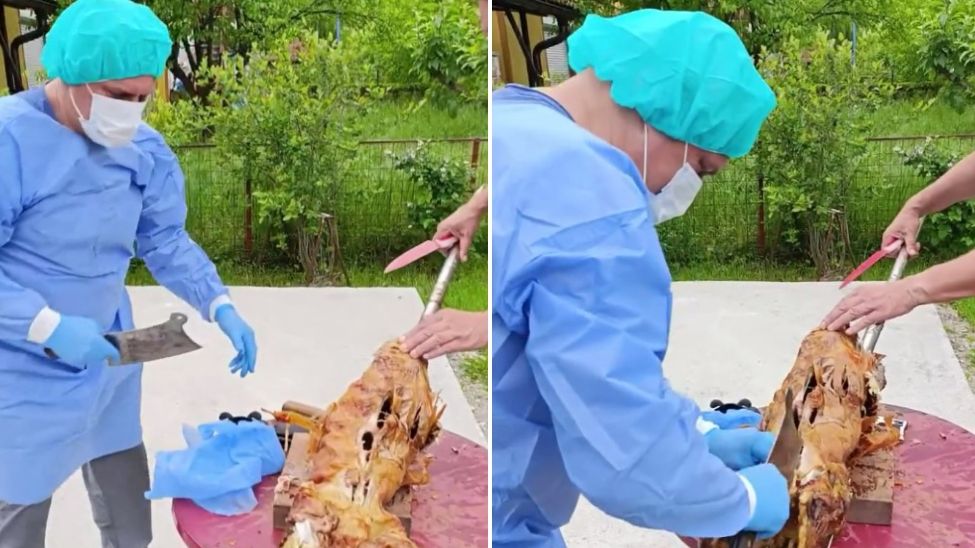Kako roštiljanje povodom 1. maja ne bi bilo monotono potrudio se jedan čovjek koji se obukao kao hirurg, pa je "operisao" pečeno janje.