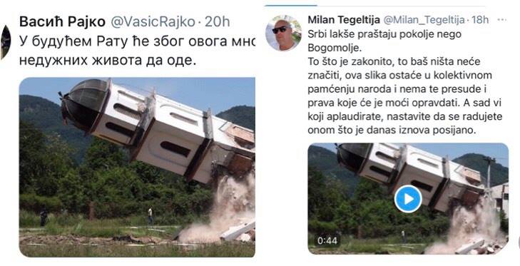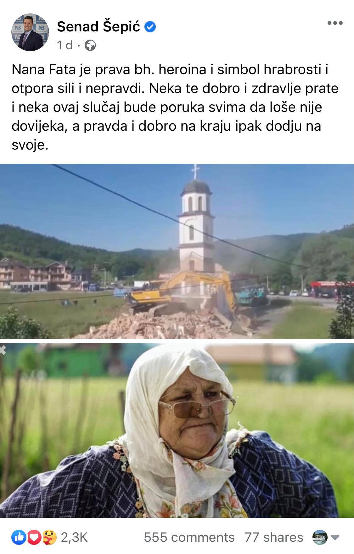 Uklanjanje ili rušenje nelegalno izgrađene crkve u Konjević Polju na zemlji nane Fate Orlović izazvalo je brojne reakcije. Iako je riječ o pravosnažnoj presudi Evropskog suda za ljudska prava u Strazburu, a svi rokovi već odavno prošli za njeno uklanjanje, za neke je ovo bila najava novih ratova, a za neke datum koji treba proglasiti danom sjećanja. I tokom samog rušenje crkve koje je trajalo od ranih jutarnjih sati do 12 sati kada je srušen i crkveni toranj (zvonik) upućivane su brojne prijetnje Bošnjacima novih ratovima i prolijevanjem krvi. Iz gnusne psovke proklinjali su bošnjački narod i islam i vjerske simbole. I neki poznatiji pripadnici političkog života Srba nisu propustili priliku i oglasili se se povodom rušenje crkve. Milan Tegeltija, nekadašnji predsjednik VSTV-a a zatim savjetnik člana Predsjedništva BiH Milorada Dodika napisao je na Twitteru: “Srbi lakše praštaju pokolje nego bogomolje. To što je zakonito, to baš ništa neće značiti, ova slika ostaće u kolektivnom pamćenju naroda i nema te presude i prava koje će je moći opravdati. A sad vi koji aplaudirate, nastavite da se radujete onom što je danas iznova posijano”, naveo je Tegeltija. Nekadašnji izvršni sekretar Saveza nezavisnih socijaldemokrata (SNSD) Rajko Vasić, poznat po svojim huškačkim stavovima, napisao je još goru poruku: “U budućem ratu će zbog ovoga mnogo nedužnih života da ode”, dijeleći sliku srušene crkve. Na objave Vasića i Tegeltije reagirao je i direktor Memorijalnog centra Potočari Emir Suljagić. “Za manje se u ovoj zemlji zna ‘formirati predmet’. Ali moraš da budeš musliman”, napisao je Suljagić. Senad Šepić, predsjednik Nezavisnog bloka je na svome twitter i fb nalogu napisao: “Nana Fata je prava bh. heroina i simbol hrabrosti i otpora sili i nepravdi. Neka te dobro i zdravlje prate i neka ovaj slučaj bude poruka svima da loše nije dovijeka, a pravda i dobro na kraju ipak dodju na svoje.” Denis Zvizdić, član Kolegija PD PS BiH takodjer se oglasio na Twitteru s prijedlogom da institucija na svim nivoima od općine do države u kalendaru obilježavanja značajnih datuma i događaja uvrste 5. juni kao "dan sjećanja na uspješnju borbu za pravdu i istinu nane Fate Orlović.