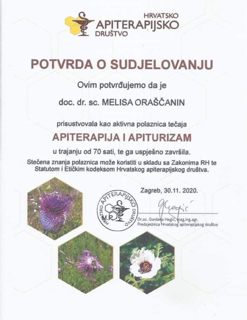 „Tečaj je također namijenjen onima koji žele pokrenuti svoj posao vezan uz pčelarstvo, ekološko pčelarstvo, apiturizam, apiterapiju, proizvodnju i stavljanje na tržište pripravaka od pčelinjih proizvoda bilo da se radi o dodacima prehrani ili kozmetičkim proizvodima, kremama, sapunima, suvenirima. Namijenjena je i pčelarima i svima onima koji se time tek žele baviti, bilo kao hobijem, bilo kao izvorom prihoda, bilo kao terapijom za svoje zdravstvene tegobe. Radosna sam jer se dodatno educirala na tečaju koji je organiziralo tokom zadnjih pola godine Hrvatsko apiterapijsko društvo. Tečaj se održava 9 subota u kontinuitetu u terminu od 12-18 sati. Nakon toga slijedila je pauza od mjesec dana za izradu seminarskih radova. Teme seminara su odabirali sami, a na kraju smo imali završnu odbranu svojih radova i dodjeljivanje certifikata. Uz pohađanje tečaja koristili smo i izuzetan priručnik kojeg je priredila dr.sc. Gordana Hegić s naslovom „Pčelarstvo –Apiterapija-Apiturizam“.
