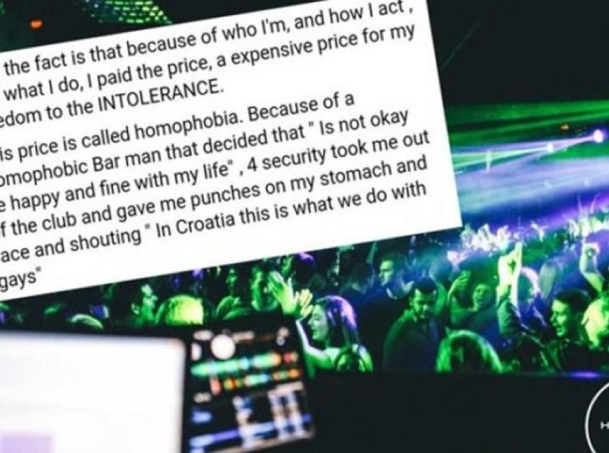 “Ta cijena se zove homofobija. Čovjek koji radi u homofobnom baru odlučio je da nije u redu da ja budem sretan sa svojim životom. Četiri zaštitara odvela su me vani i udarali su me u lice i trbuh govoreći ‘Ovako mi to radimo s gayevima u Hrvatskoj'”, stoji u poruci.