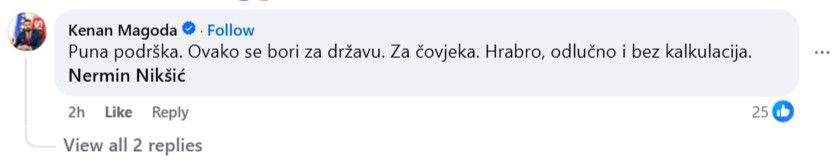 - Puna podrška. Ovako se bori za državu. Za čovjeka. Hrabro, odlučno i bez kalkulacija - napisao je Magoda.