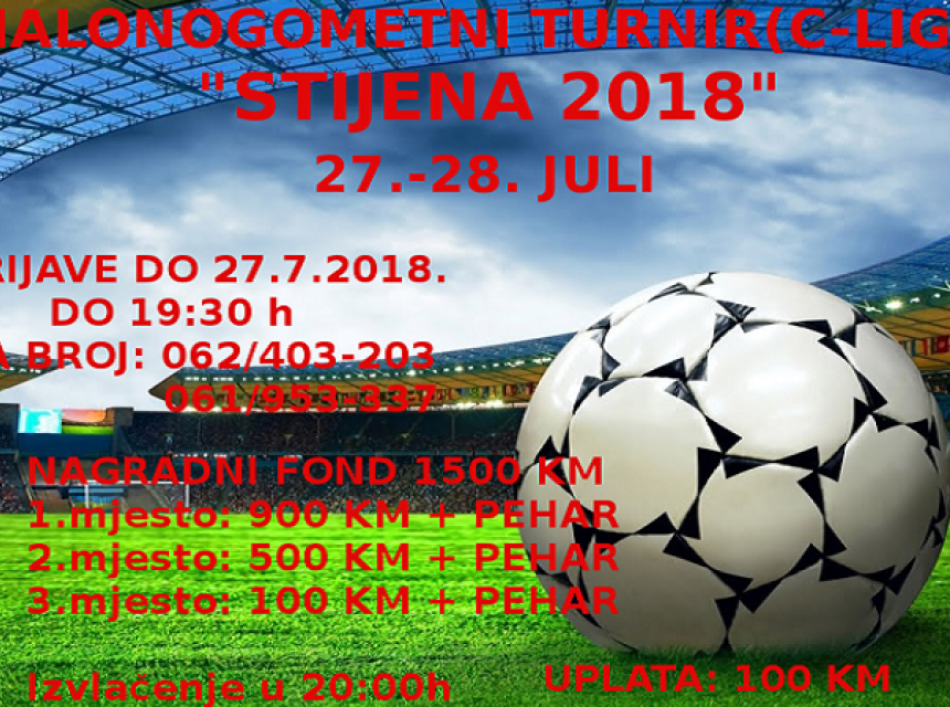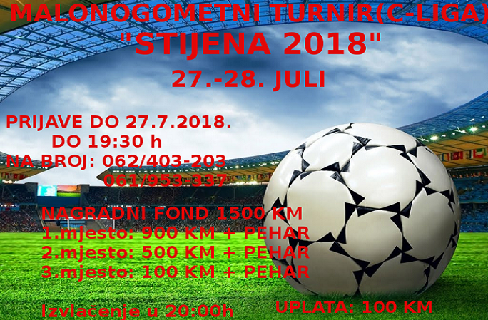 Obavještavamo sve zaintresirane da će se Malonogometni turnir "Stijena 2018" u sklopu C-Lige održati u Stijeni od 27.- 28. jula sa početkom u 20:00 sati.