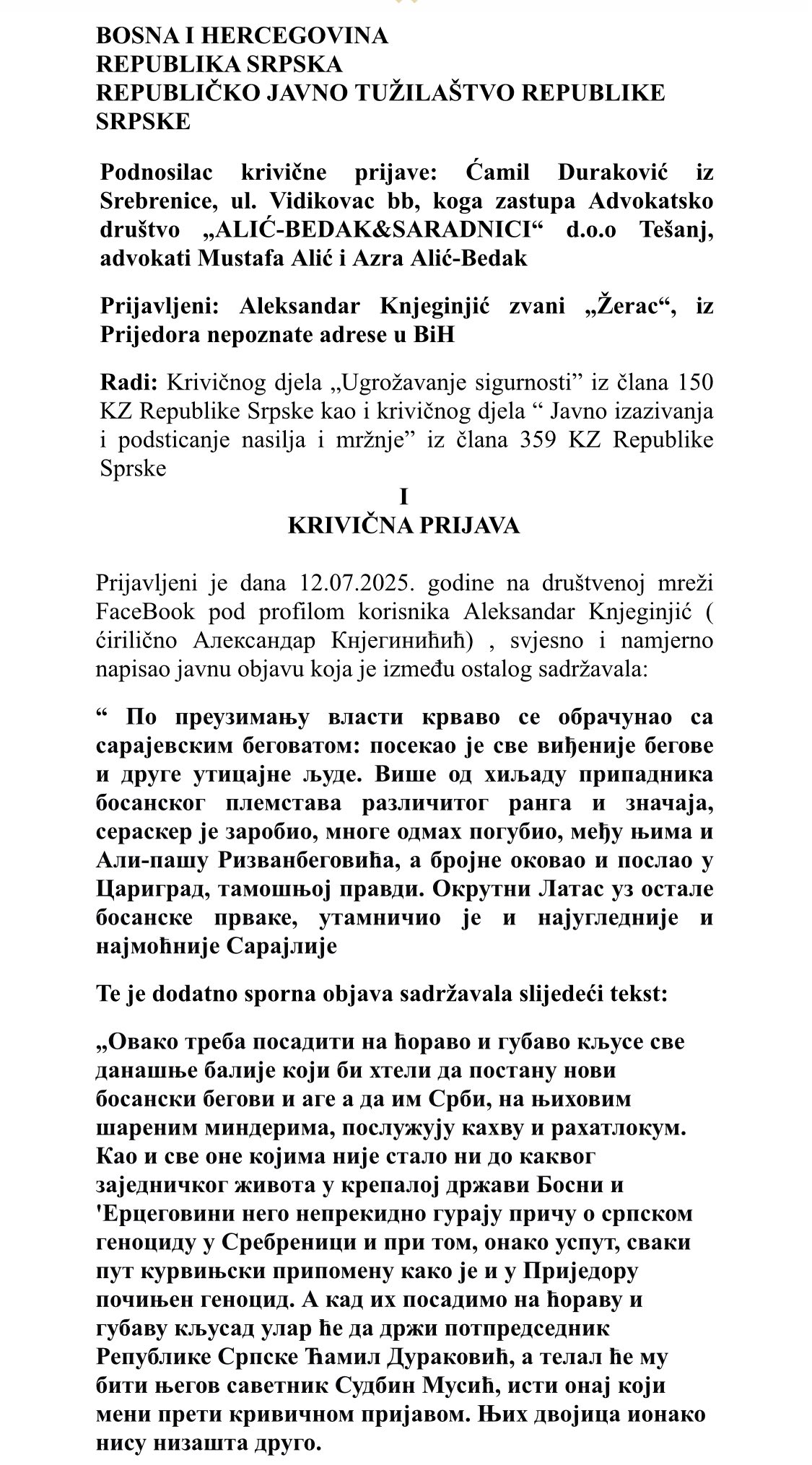 Potpredsjednik entiteta Republika Srpska (RS) Ćamil Duraković je na svom Facebook profilu otkrio da je podnio krivičnu prijavu protiv Aleksandra Knjeginjića, koji je prijetio Bošnjacima iz ovog entiteta.