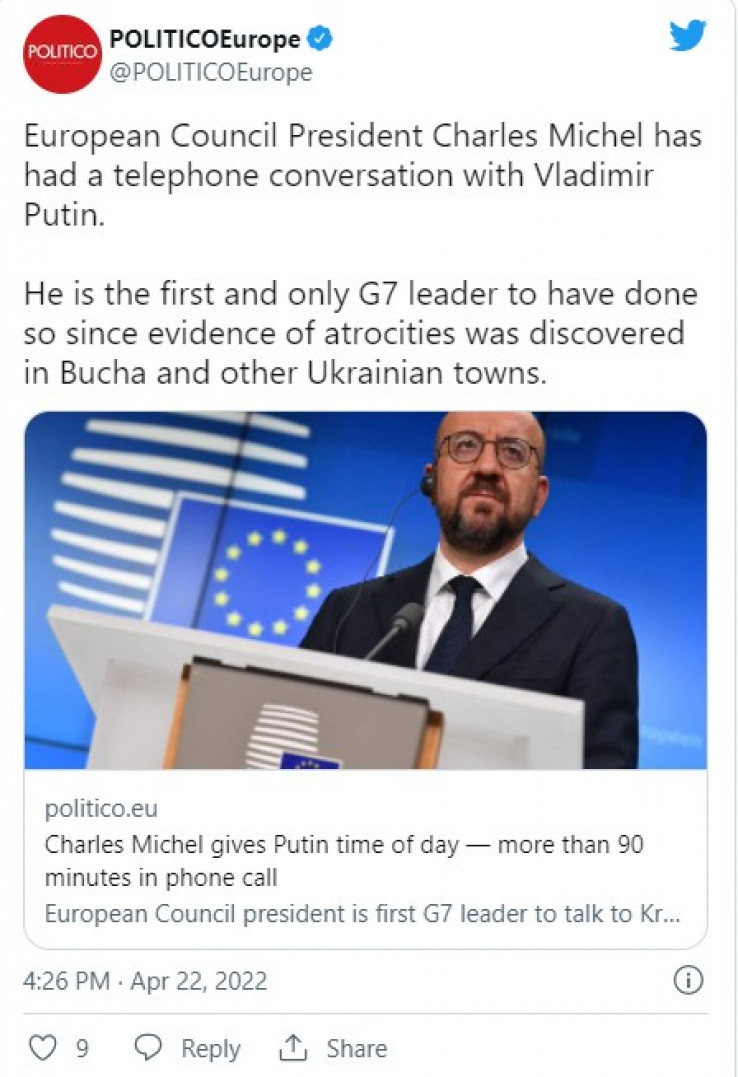 U razgovoru s Putinom, Mičel je naglasio na nedvosmislen način neprihvatljivost ruskog rata i u detalje je iznio cijenu sankcija koje je EU uvela Rusiji.