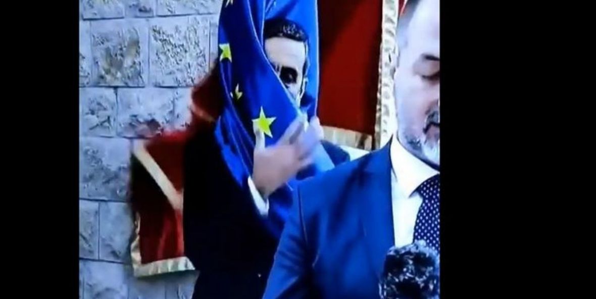 Dok je premijer Krivokapić držao govor, puhnuo je vetar, pa je zastava EU “napala” Alkovića i obmotala mu se oko glave.