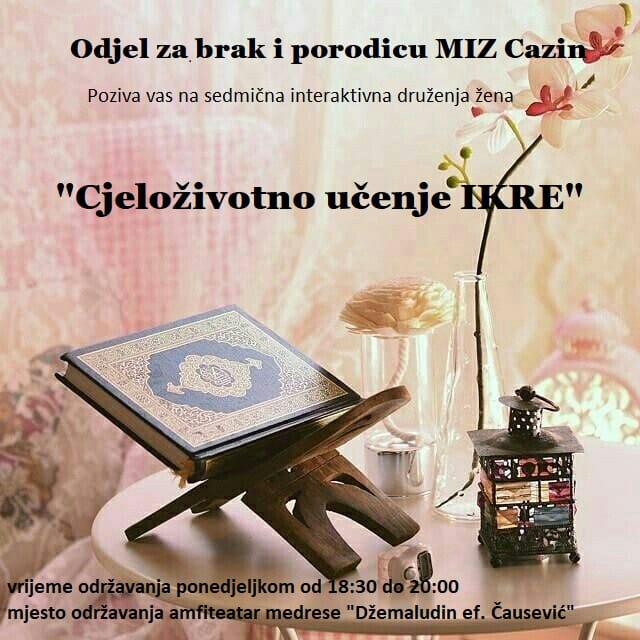 Tijelu pridajemo dovoljno pažnje, zar ne?! Učinimo nešto i za svoju dušu, jer samo uspješno uspostavljena harmonija i ravnoteža između duhovnog i tjelesnog daje istinski sretnu, zdravu i ispunjenu ličnost", stoji u pozivu na ova druženja Ljubijankić Nermine, profesorice i koordinatorice za Odjel za brak i porodicu MIZ Cazin.