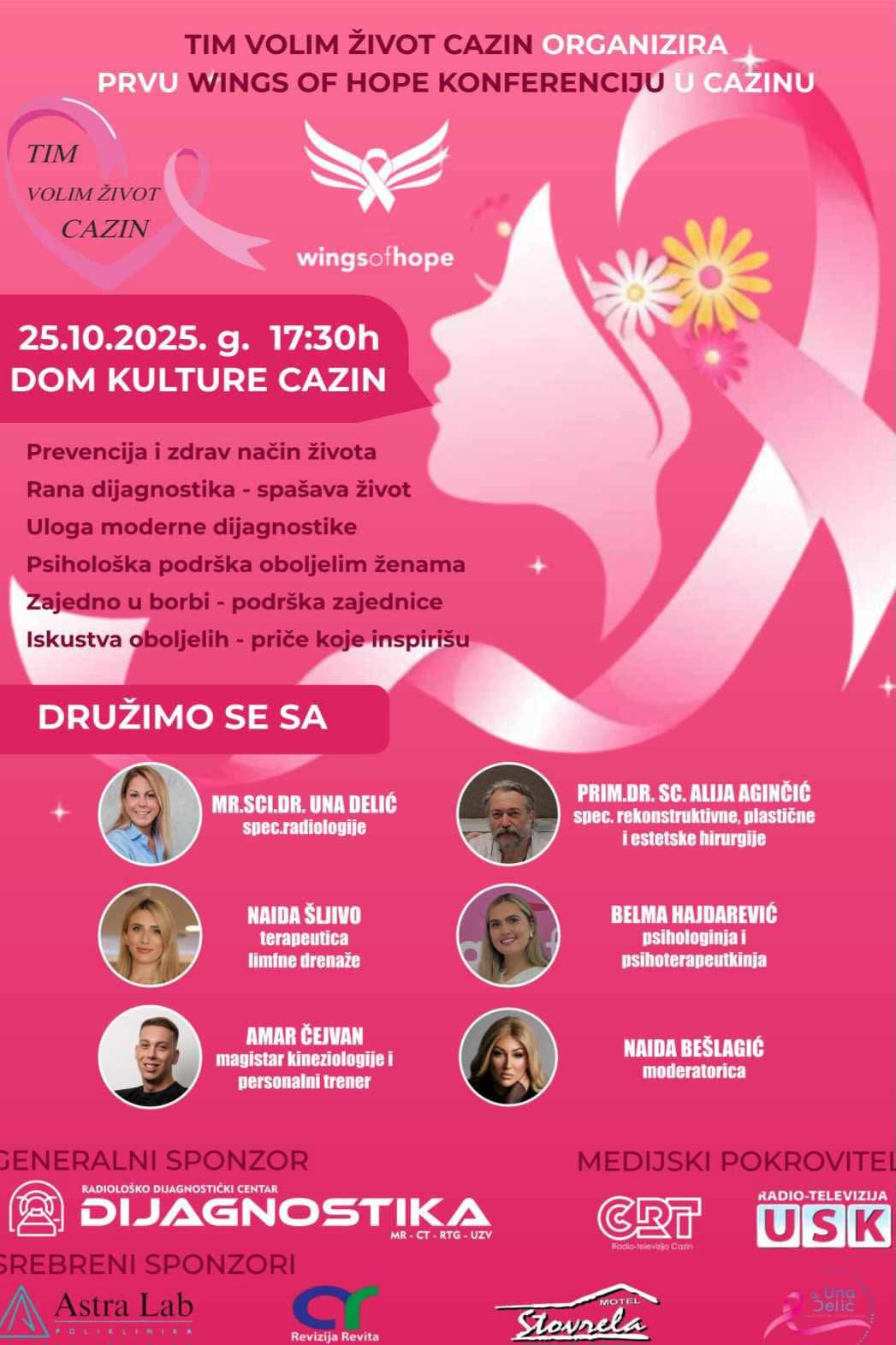 U organizaciji Tima “Volim život Cazin”, u Domu kulture Cazin će u subotu, 25. oktobra 2025. godine s početkom u 17:30 sati, biti održana prva “Wings of Hope” konferencija – događaj posvećen podizanju svijesti o prevenciji, ranom otkrivanju i psihološkoj podršci ženama oboljelim od raka dojke.