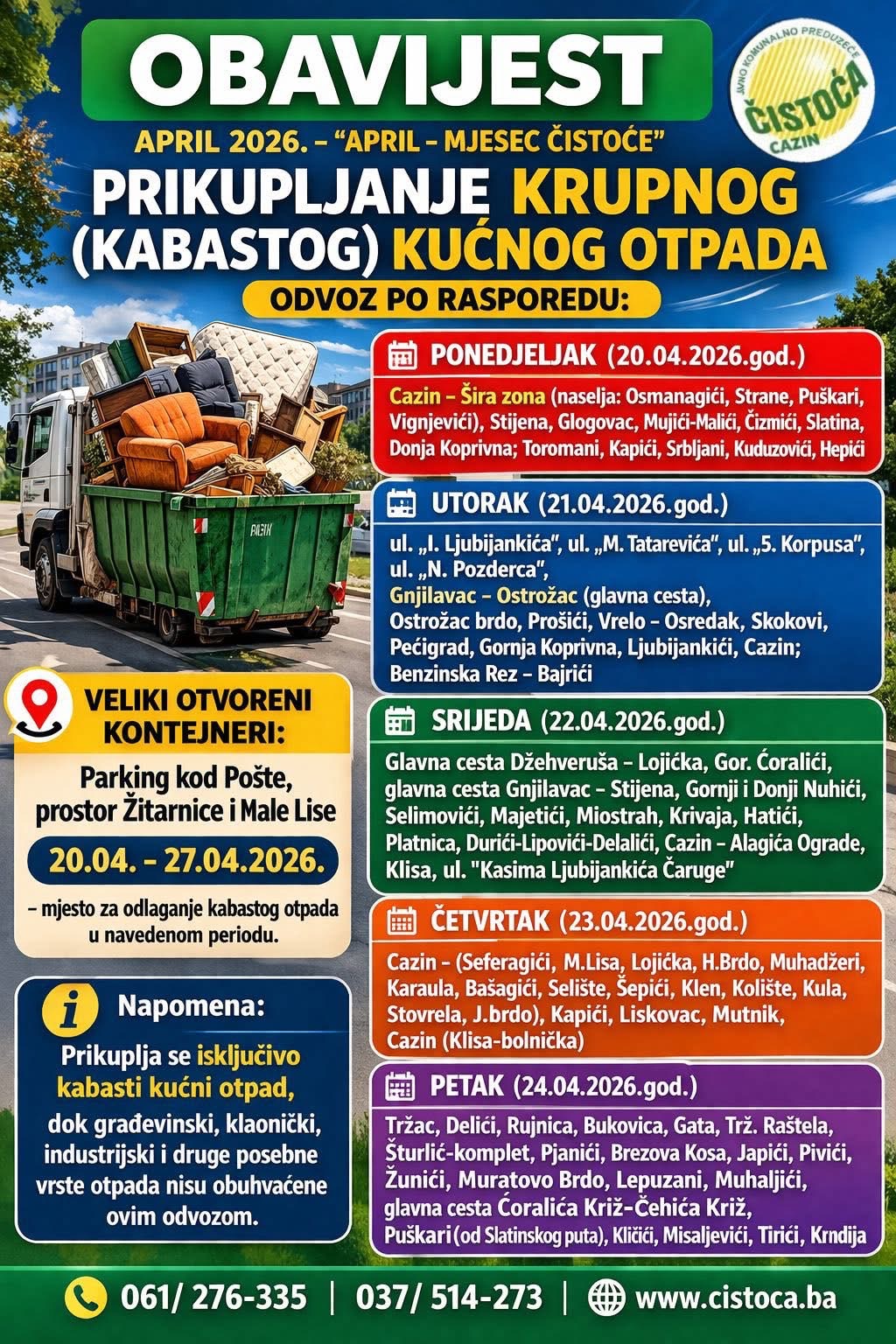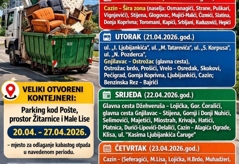 Poseban segment ovogodišnje akcije odnosi se na organizovani odvoz kabastog (krupnog) kućnog otpada, koji će biti realizovan u periodu od 20. do 24. aprila 2026. godine, prema unaprijed utvrđenom rasporedu i zajedno sa redovnim odvozom otpada.