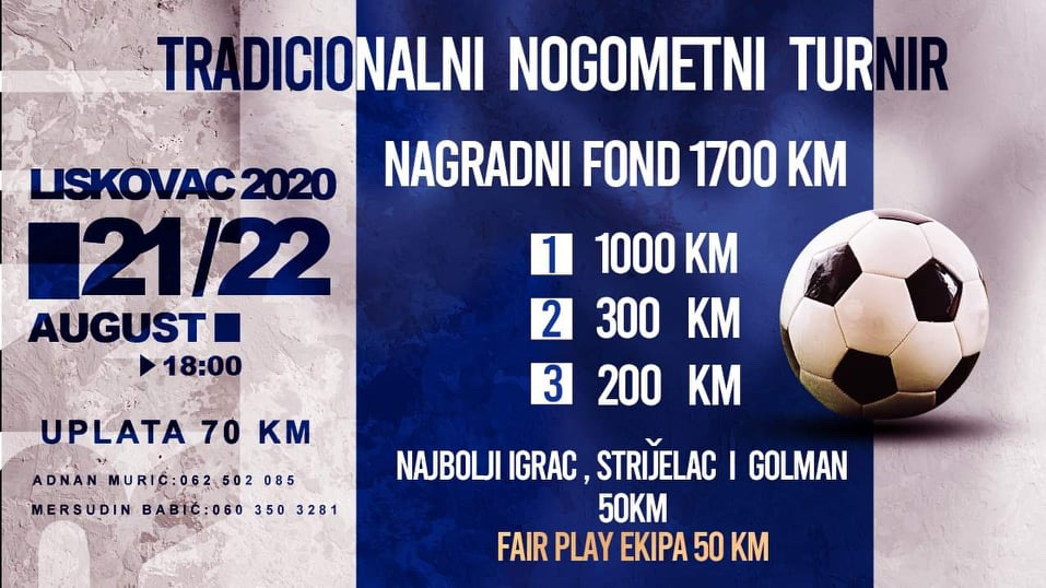 U mjestu Liskovac organizuje se malonogometni turnir “Liskovac 2020”, a nagradni fond turnira iznosi 1700 KM, dok kotizacija za učešće iznosi 70 KM.