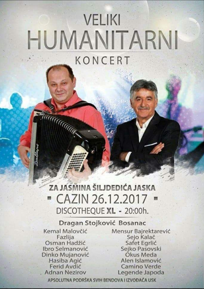 Veliki koncert koji se organizuje u svrhu prikupljanja novčanih sredstava za liječenje oboljelog Jasmina održat će se 26.12.2017. godine u diskoteci XL u Cazinu s početkom u 20:00 sati.