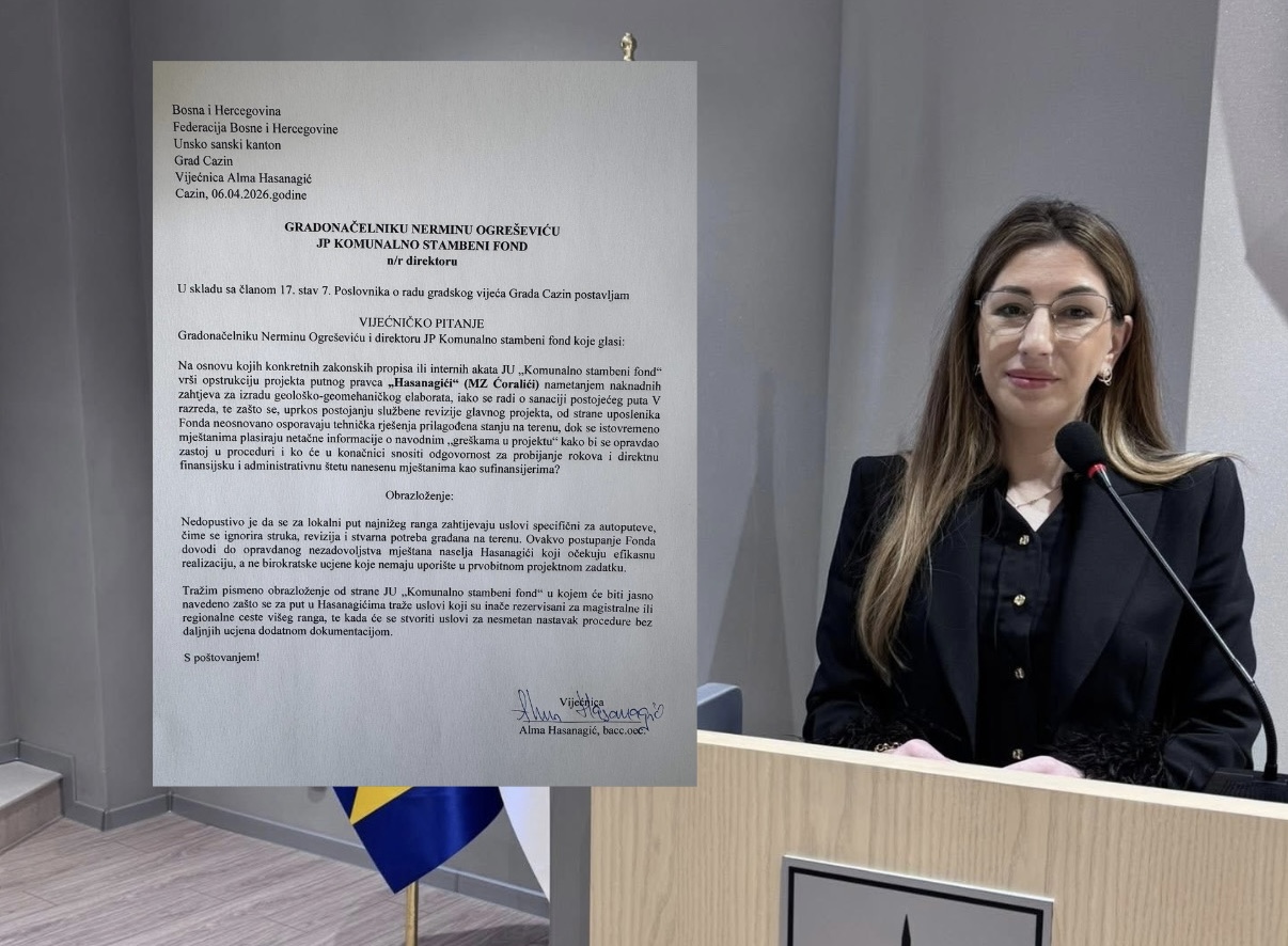Vijećnica u Gradskom vijeću Cazina, Alma Hasanagić, pokrenula je vijećničko pitanje u vezi s projektom sanacije lokalnog puta u naselju Hasanagići (MZ Ćoralići), ukazujući na, kako navodi, neprihvatljive administrativne prepreke i dodatne zahtjeve koji usporavaju realizaciju projekta.