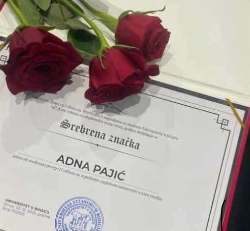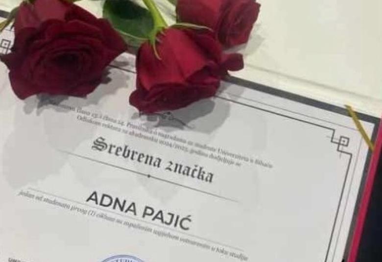 Adna Pajić iz Cazina ostvarila je izuzetan akademski uspjeh i postala dobitnica Srebrene značke Univerziteta u Bihaću, jednog od najviših priznanja koje se dodjeljuje studentima sa izvanrednim rezultatom tokom studija.