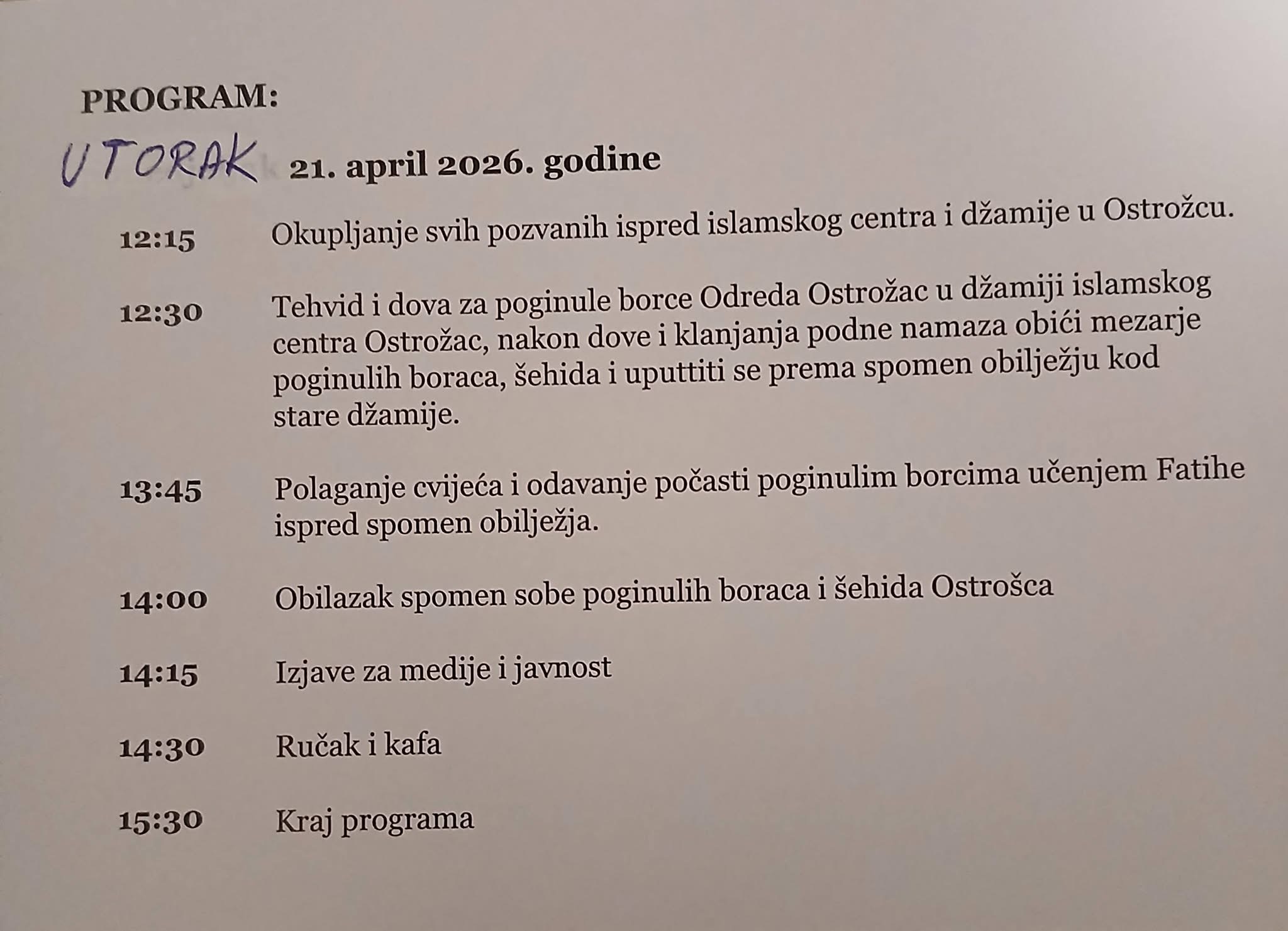 Centralni dio programa predviđen je u 13:45 sati, kada će biti položeno cvijeće i odata počast poginulim borcima učenjem Fatihe ispred spomen-obilježja. Nakon toga, u 14:00 sati, učesnici će imati priliku obići spomen-sobu posvećenu poginulim borcima i šehidima Ostrošca.