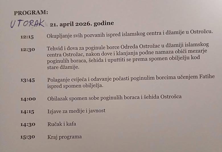 U utorak, 21. aprila 2026. godine, u Ostrošcu će biti obilježena 34. godišnjica u znak sjećanja na poginule borce Odreda Ostrožac, uz niz sadržaja koji imaju za cilj očuvanje kulture pamćenja i odavanje počasti šehidima.