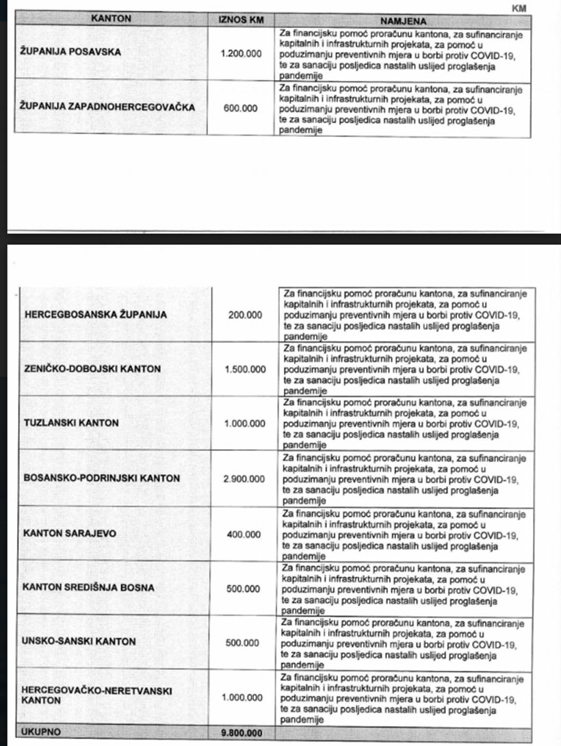 Donosimo vam tabelu raspodijeljenih sredstava od strane Vlade FBiH za gradove i općine u Federaciji Bosne i Hercegovine, u svrhu pomoći u borbi protiv koronavirusa.