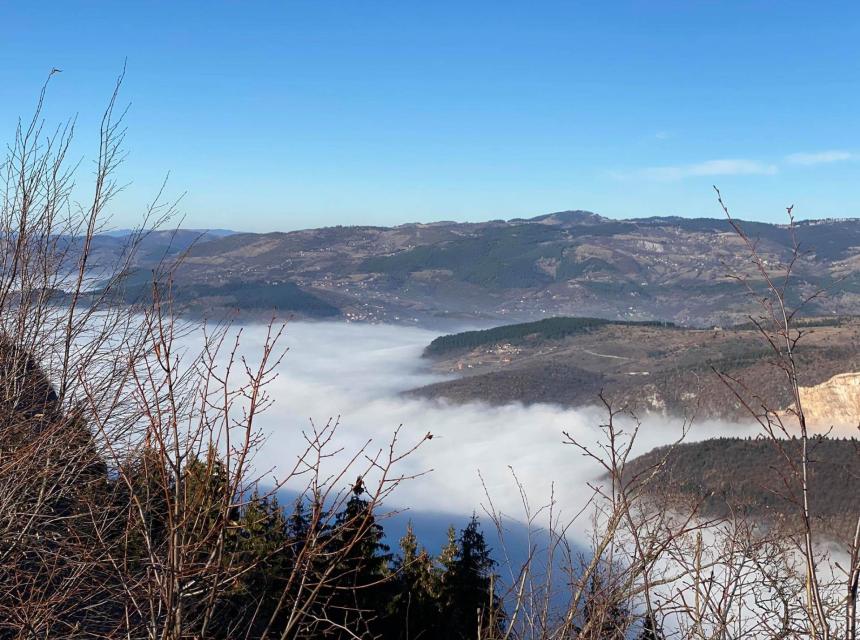 Kako se vidi i na našim fotografijama, iznad Sarajeva je primijetan čep, dok je Trebević obasjan suncem, a građani koriste sunčani dan na ovoj planini šetajući i udišući svježi i zdravi zrak