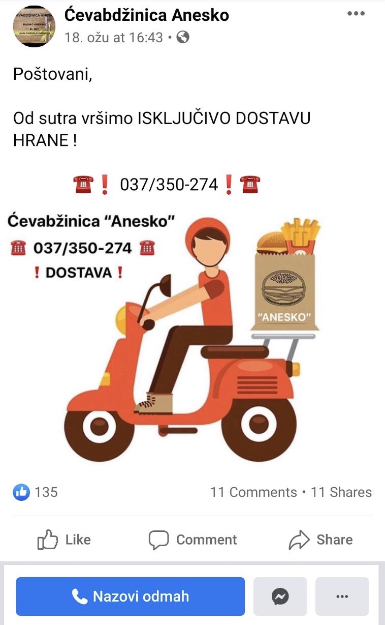 U ovom periodu vršit će isključivo dostavu ćevapa i pljeskavica: