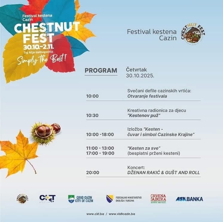 Na Trgu Alije Izetbegovića svečano je otvoren Festival kestena “Chestnut Fest”, tradicionalna manifestacija koja afirmiše prirodno i kulturno naslijeđe Cazinske krajine i traje od 30. oktobra do 2. novembra.