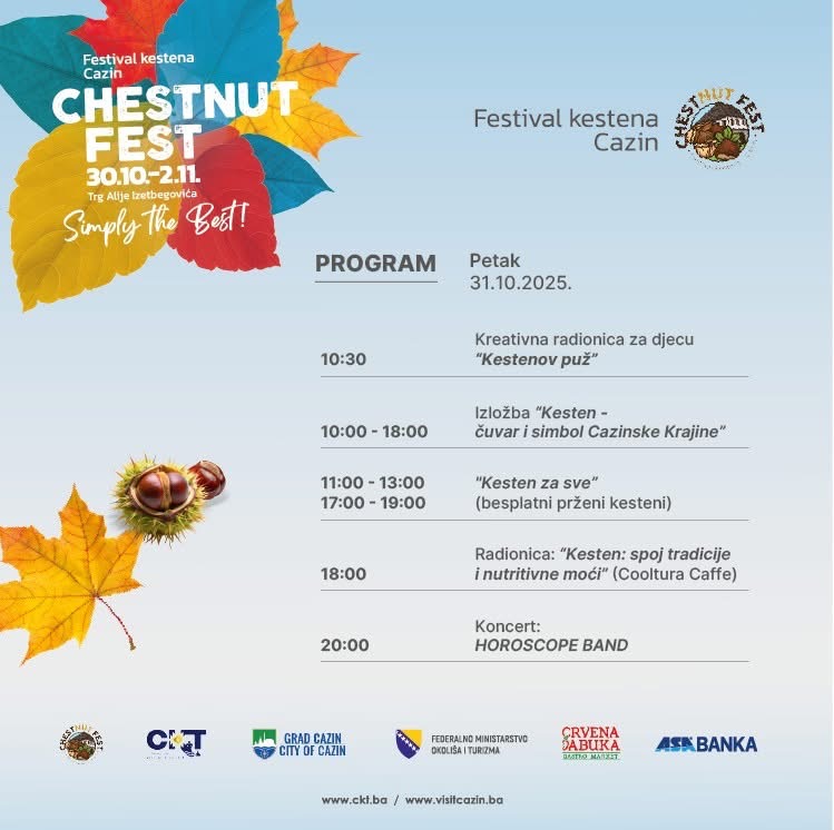 Drugog dana festivala, u petak 31. oktobra, mališani i kreativci uživat će u radionici “Kestenov puž”, dok će izložba “Kesten – čuvar i simbol Cazinske Krajine” biti otvorena tokom cijelog dana.