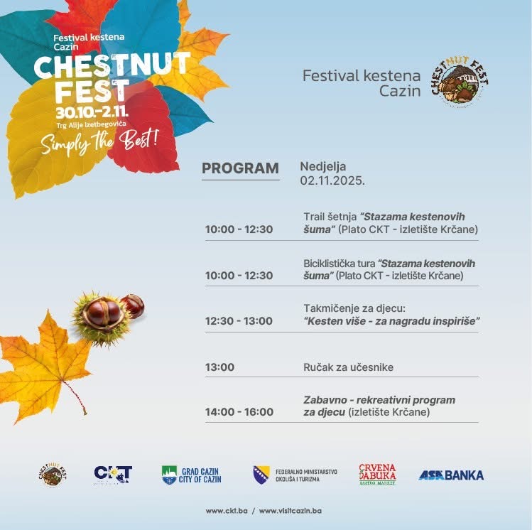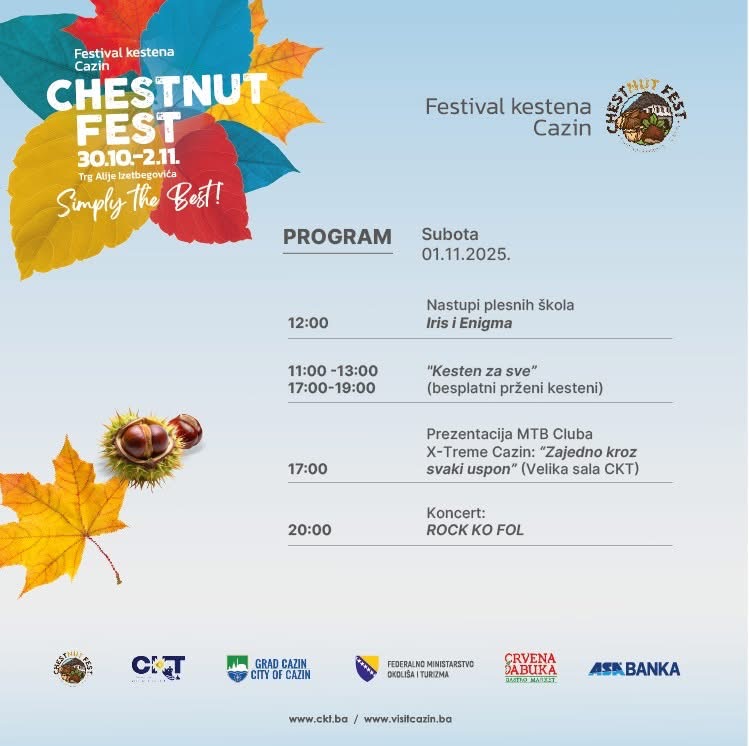 Organizatori pozivaju sve da tokom vikenda posjete Cazin i uživaju u mirisu pečenog kestena, zabavnim sadržajima i bogatom kulturnom programu.