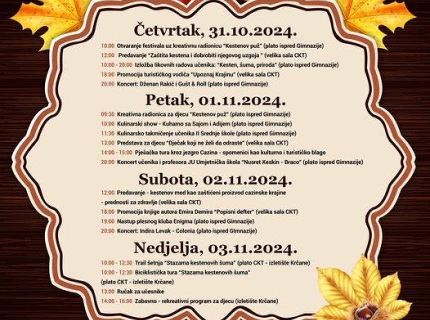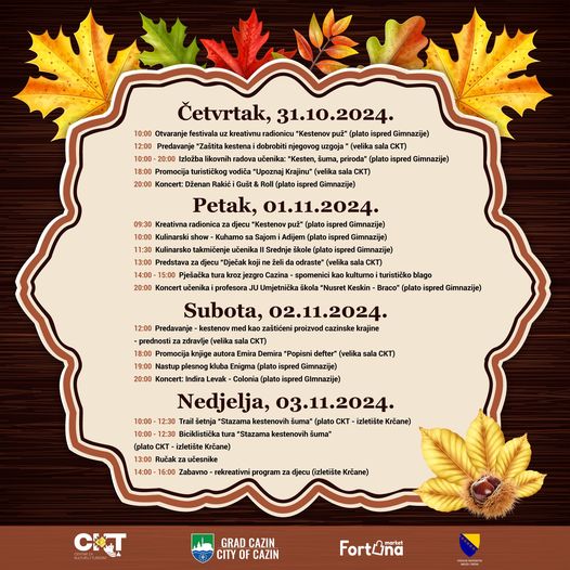 Uz bogat program četvrtog festivala “Chest Fest” družimo se od 31.10. do 03.11.2024 godine, na lokaciji Trga Alije Izetbegovića, gdje će se realizirati program prva tri dana festivala. Posljednjeg dana imamo sportsko-rekreativne aktivnosti koje će nas voditi kestenovim šumama u prirodu, na jedan veliki zajednički izlet i druženje.