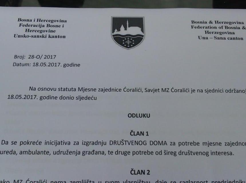 Savjet Mjesne zajednice Ćoralići je na zadnjoj sjednici održanoj 18.05.2017. godine donio odluku pokretanja inicijative za izgradnju Društvenog doma.