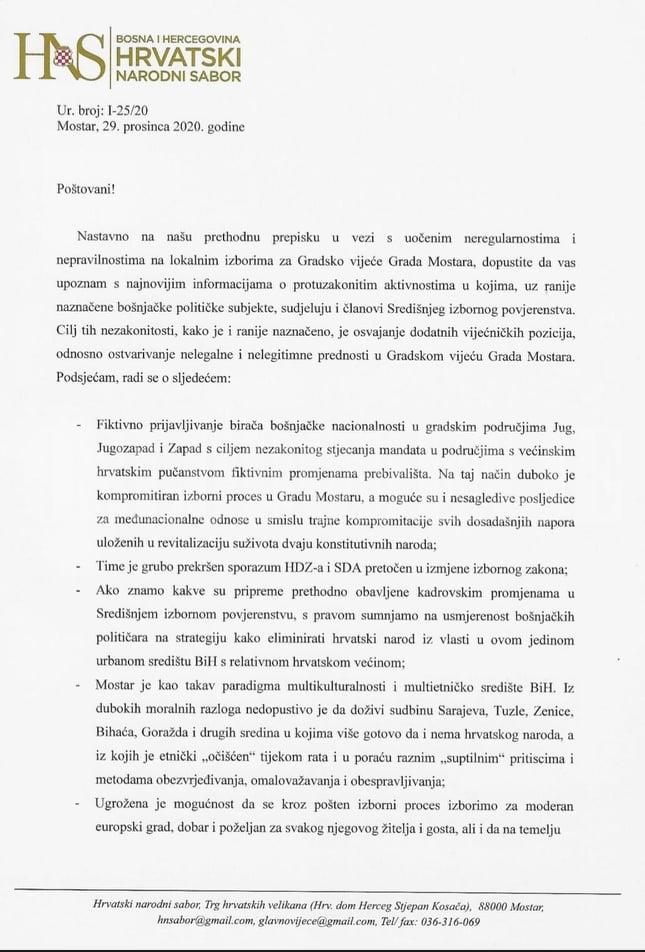 - Poštovani, nastavno na našu prethodnu prepisku u vezi sa uočenim neregularnostima i nepravilnostima na lokalnim izborima za Gradsko vijeće Grada Mostara, dopustite da vas upoznam sa najnovijim informacijama o protuzakonitim aktivnostima u kojima, uz ranije naznačene bošnjačke političke subjekte, sudjeluju i članovi Centralne izborne komisije (CIK) BiH.