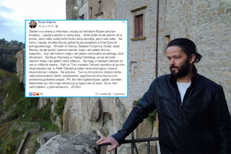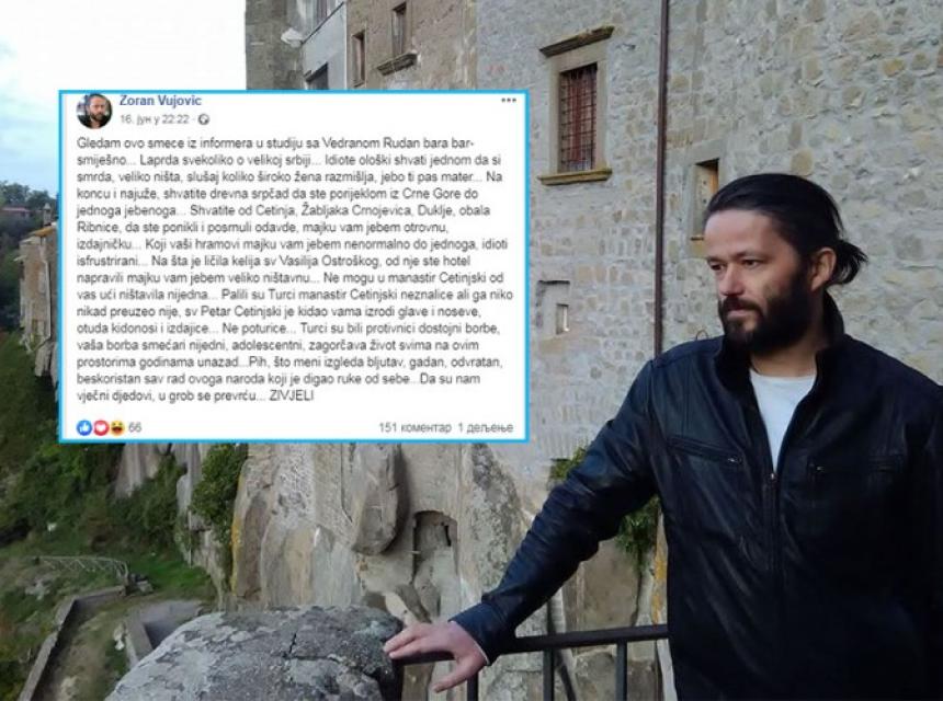 Koji vaši hramovi majku vam je**m nenormalno do jednoga, idioti isfrustrirani. Na šta je ličila sv. Vasilija Ostroškog, od nje ste hotel napravili majku vam je**m veliko ništavnu. Ne mogu u manastir Cetinjski od vas ući ništavila nijedna. Palili su Turci manastir Cetinjski neznalice ali ga niko nikad preuzeo nije, sv. Petar Cetinjski je kidao vama izrodi glave i noseve otuda kidonosi i izdajice... Ne poturice. Turci su bili protivnici dostojni borbe, vaša borba smećari nijedni, adoscelentni, zagorčava život svima na ovim prostorima godinama unazad. Pih, što meni izgleda bljutav, gadan, odvratam, beskoristan sav rad ovoga naroda koji je digao rekao od sebe... Da su nam večni dedovi, u grob se prevrću.. Živeli", napisao je Vujović u svojoj objavi.