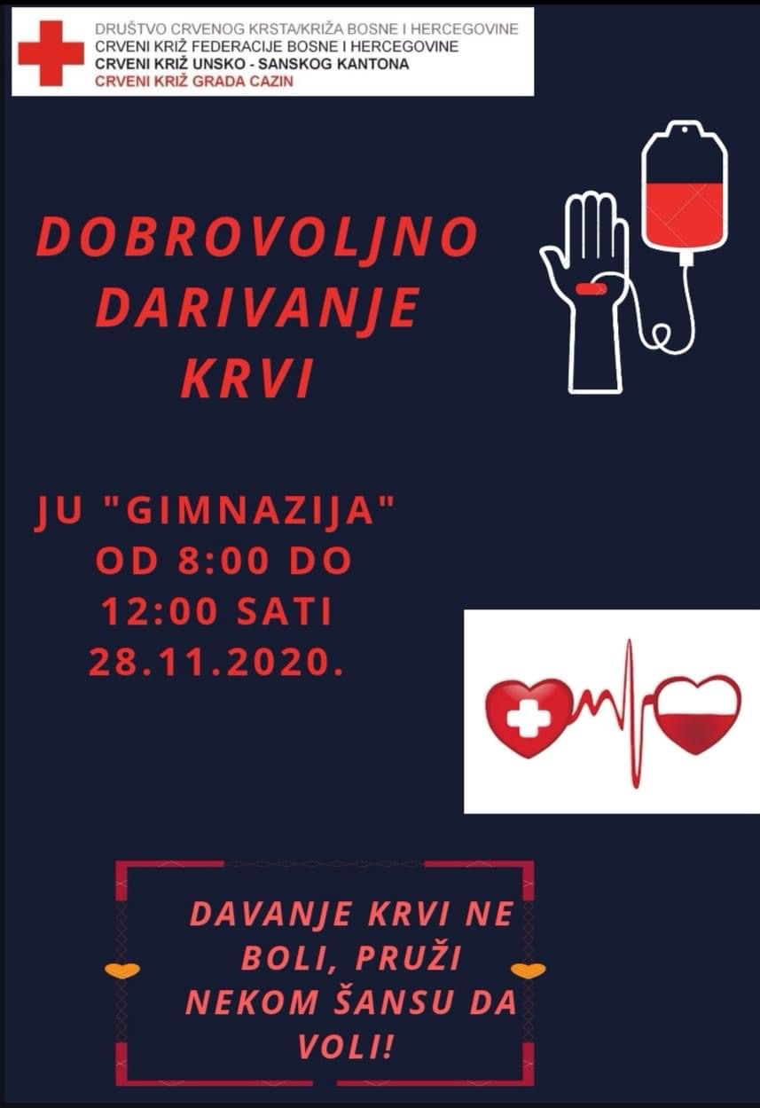 Crveni križ grada Cazin organizuje još jednu akciju dobrovoljnog darivanja krvi, koja će se održati u JU "Gimnazija" Cazin sa početkom u 8:00h do 12:00h.