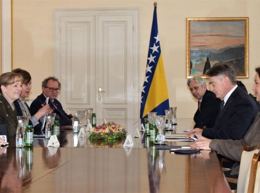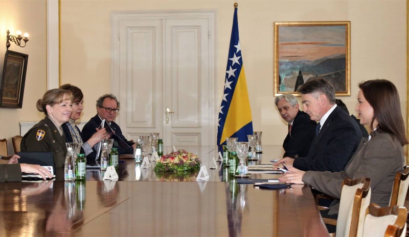 Željko Komšić se zahvalio brigadnoj generalici Pameli McGaha na pomoći i podršci reformskim i integracijskim procesima u BiH u oblasti odbrane, te je izrazio uvjerenje da će se nastaviti razvijati i u budućnosti s ciljem harmoniziranja OS BiH sa NATO standardima.