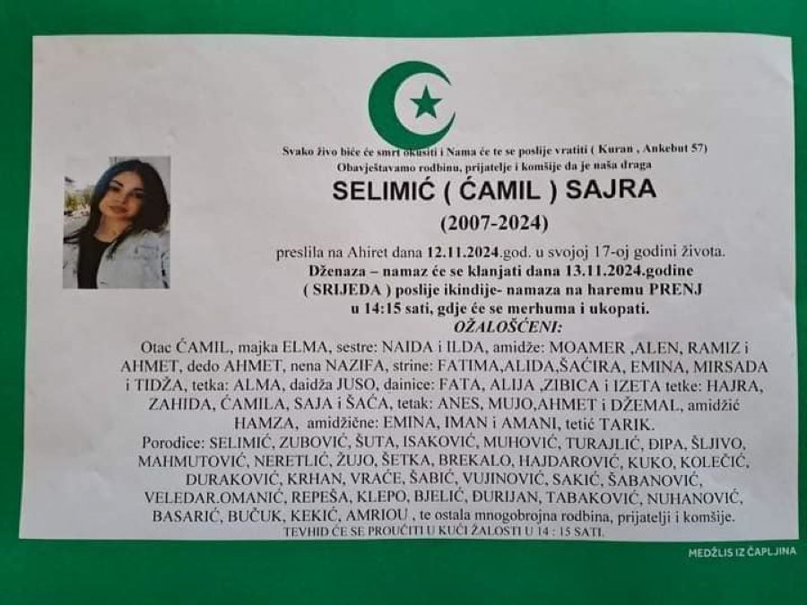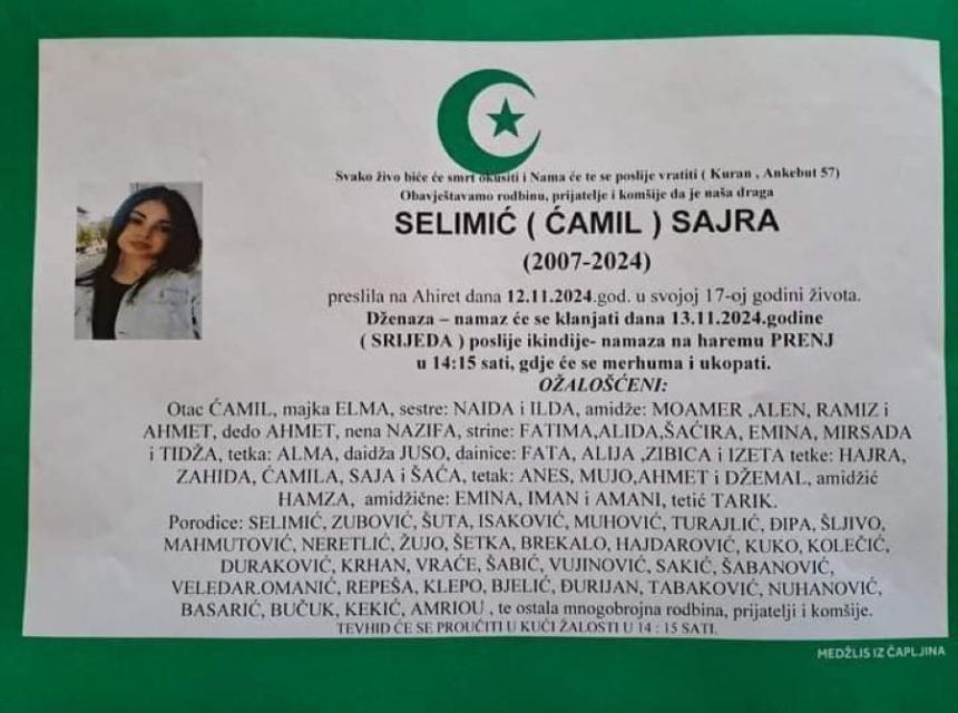 Upućujemo najdublje saučešće i riječi podrške porodici Selimić. Da im dragi Bog podari mnogo sabura u ovim teškim životnim trenucima. Molimo Allaha dž.š. da se smiluje našoj Sajri i podari joj najljepše mjesto u Džennetu, a neka njen prelijepi osmijeh krasi neki drugi, ljepši svijet...