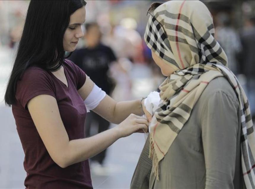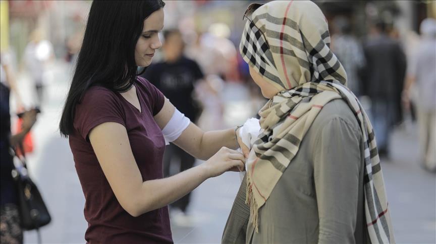 Uposlenici i volonteri Muzeja žrtava zločina protiv čovječnosti i genocida 1992.-1995. u centru Sarajeva dijele bijele trake prolaznicima.