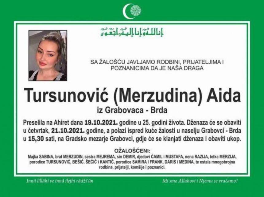 Vijest o tragičnoj smrti 25-godišnje Aide Tursunović iz Srebrenika potresla je cijelu zemlju, a danas će Aida biti ispraćena na vječni počinak. Ispred kuće žalosti u naselju Grabovci- Brda u 15:30 sati krenut će se na Gradsko mezarje Grabovci, gdje će se klanjati dženaza preminuloj djevojci.